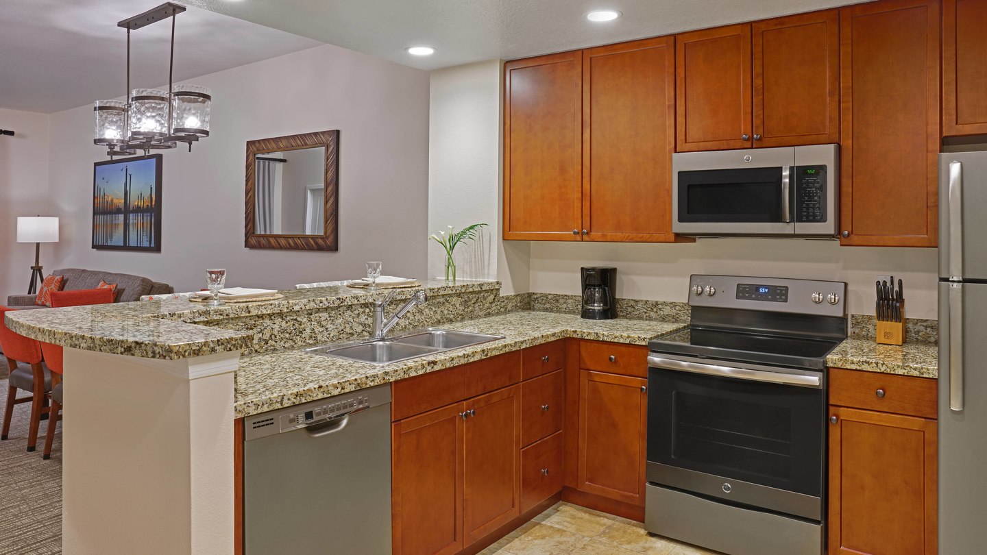 Key West: One-Bedroom Premium Villa (Two-Bedroom Lockoff Villa) - Просторная вилла, оформленная в стиле загородного дома. Спальня, гостиная с мягкой мебелью, обеденная зона, барная стойка. Полностью оборудованная кухня (плита/духовка, микровалновая печь, холодильник, посудомоечная машина, кофеварка, тостер, блендер, столовая посуда). Стиральная машина/сушка для белья. Ванная комната с гидромассажной ванной. Площадь 83 - 88 м2. Вид из номера на бассейн или на озеро.
