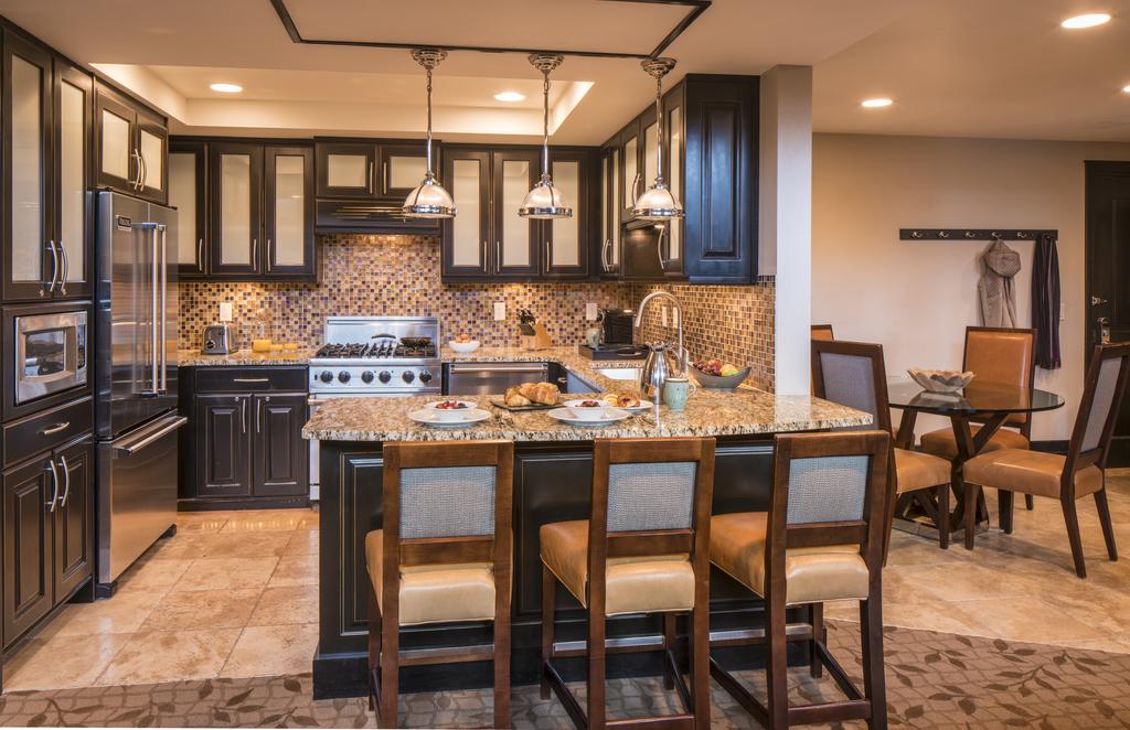 One Bedroom Residence - 81 кв.м., полностью оборудованная кухня, гостиная с обеденным столом, два газовых камина, спальня с кроватью King, софа в гостиной.